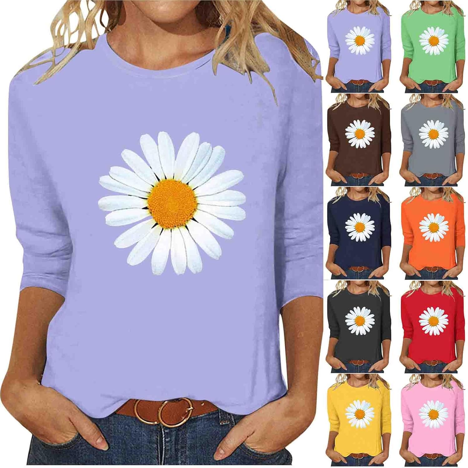 Womens Summer Tops Fashion Daisy Print Daily Shirts 3/4 Sleeve Casual Crew Neck T Shirt Dressy Tunic Blouses