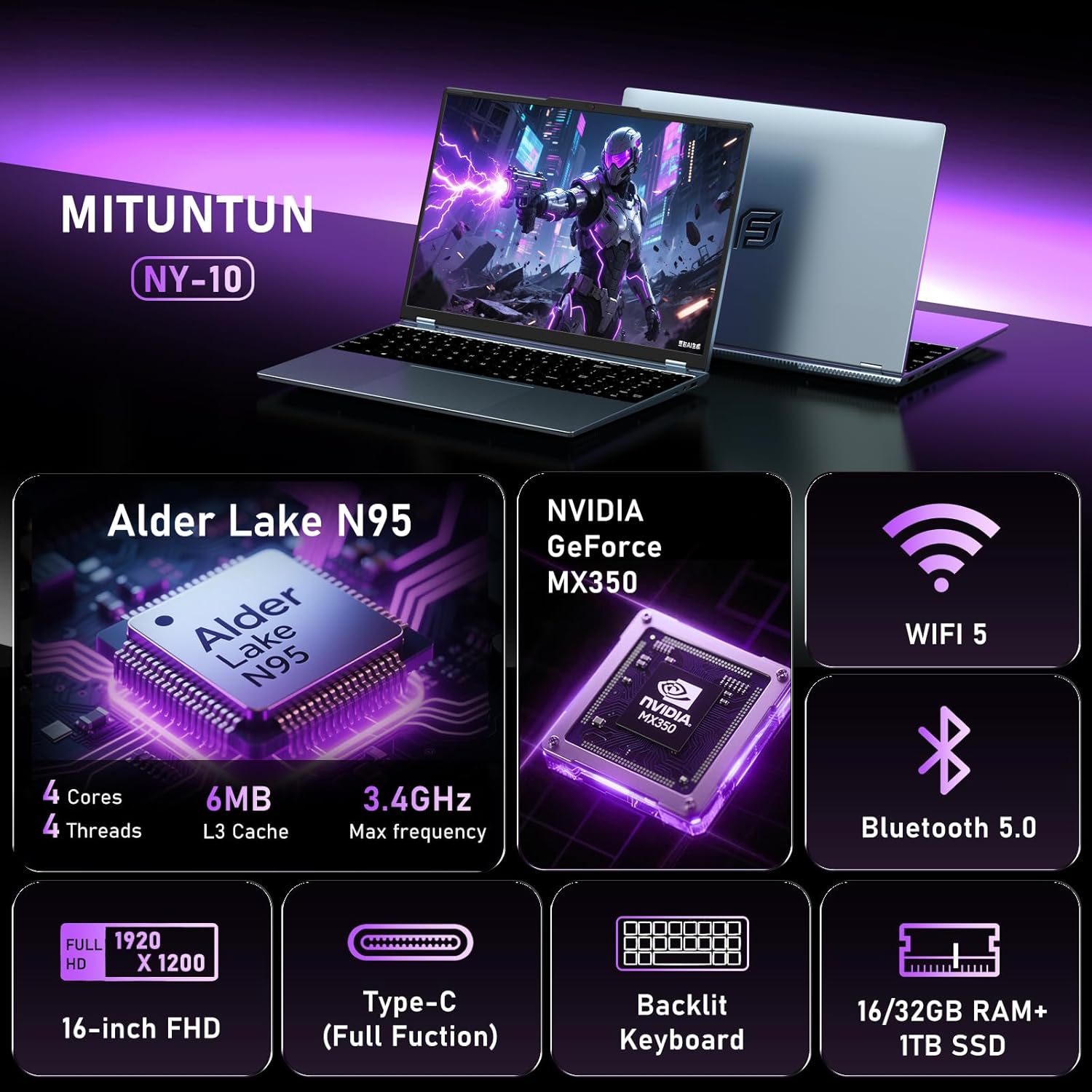 2025 Gaming Laptop, 16 Inch Laptop Computer with Geforce MX350, N95 4C/4T Processor(up to 3.4Ghz), 16GB RAM 1TB SSD, Backlit Keyboard, FHD 1920 * 1200, WiFi 5, BT 4.0